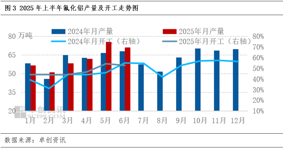据卓创资讯数据统计来看,2025年上半年国内氟化铝产能为150.05万吨,较2024年年底增加约13万吨,产能增量的原因一方面新装置投产,如河南孚德4万吨装置投产,内蒙古金鄂博9万吨装置投产,山西红然3.5万吨装置关停,另有个别装置产能略调整。在产能增加的加持下,产量亦呈现增加趋势,上半年氟化铝总产量在37.55万吨,同比增加2.32%。