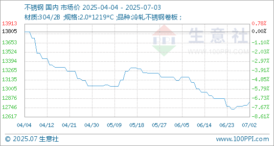 7月3日生意社不锈钢基准价为12825.00元/吨