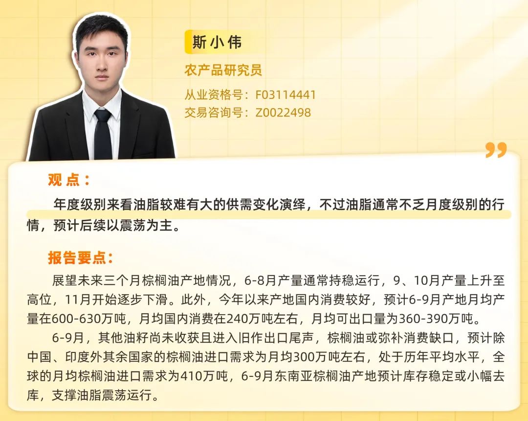 除中国、印度外其余国家6-9月全球的棕榈油进口需求假设在历年平均水平的月均300万吨左右,那么6-9月全球的月均棕榈油进口需求预计为410万吨,则6-9月棕榈油产地预计库存稳定或小幅去库。