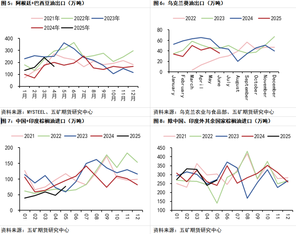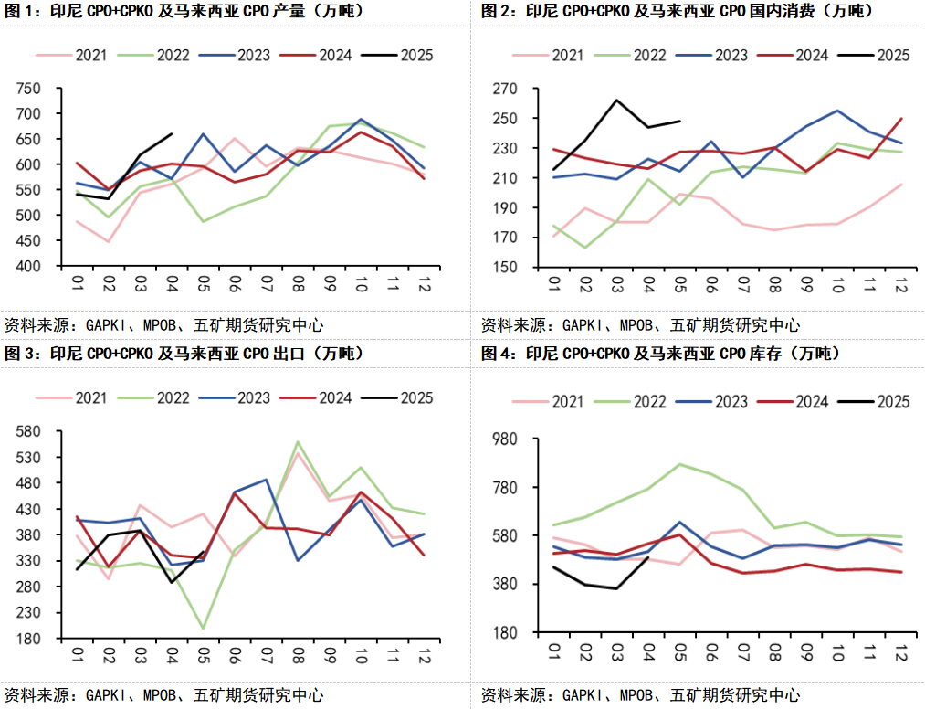 棕榈油出口在6-10月通常季节性上升, 2025年1-5月,中国和印度合计进口棕榈油及棕榈仁油同比下降约134万吨,这也直接导致了印度国内油脂库存偏低,后期或需要更多的棕榈油进口补充库存。除中国、印度外的其余国家进口同比增加约50万吨。植物油表需稍弱,印度进口植物油消费近期维持在120万吨/月左右,略有下滑,中国1-5月植物油消费中豆油同比下滑约30万吨,菜油消费持平,棕榈油表观消费下降明显约50万吨,不过进口同比下降也是消费下降的重要原因。因此预计中国和印度棕榈油6-9月进口会略高于去年,预计月均110万吨左右。