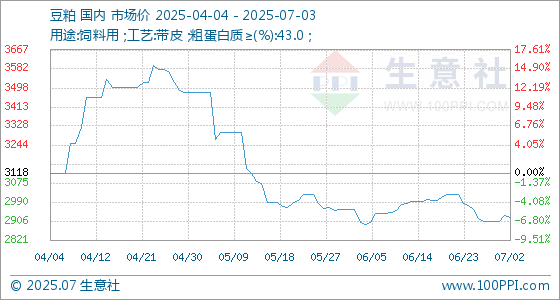 7月3日,生意社豆粕基准价为2922.00元/吨,与本月初(2906.00元/吨)相比,上涨了0.55%。