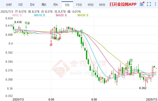 周四(7月3日)亚盘时段,纸白银目前交投于8.382元/克,跌幅0.07%,今日开盘于8.388元/克,最高触及8.418元/克,最低下探8.362元/克,目前来看,纸白银盘内短线偏向看跌走势。