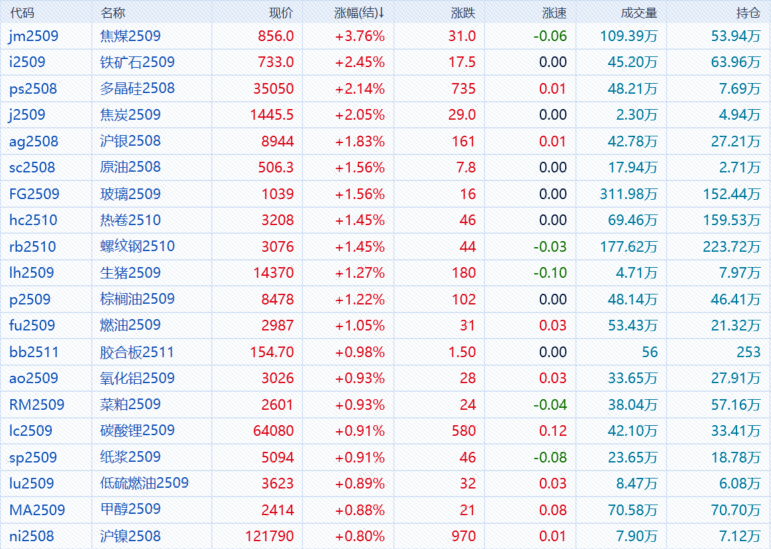 7月3日,午盘收盘,国内期货主力合约涨跌互现,焦煤涨超3%,焦炭、铁矿石、多晶硅涨超2%,沪银、SC原油、玻璃涨近2%。跌幅方面,20号胶(NR)、红枣跌超1%,工业硅、PTA跌近1%。