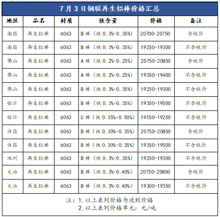 【我的钢铁】7月3日A00铝锭现货价华东20870,涨50;华南20800,涨60;中原20700,涨70(单位:元/吨) 。铝价小幅调整,再生铝棒企业视成品库存情况调价出货,品牌报价趋同,今日再生铝棒价格上涨0-50元/吨。