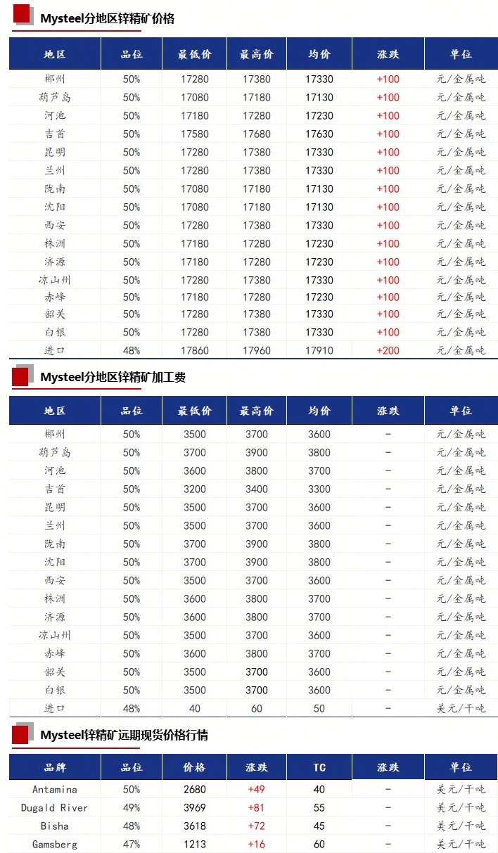 今日国内锌精矿加工费各地区未进行调整,均和上一交易日持平,受锌价的影响,锌精矿价格较昨日上调100元/金属吨。进口锌精矿加工费目前市场报价在40-60美元/干吨,暂无变化。