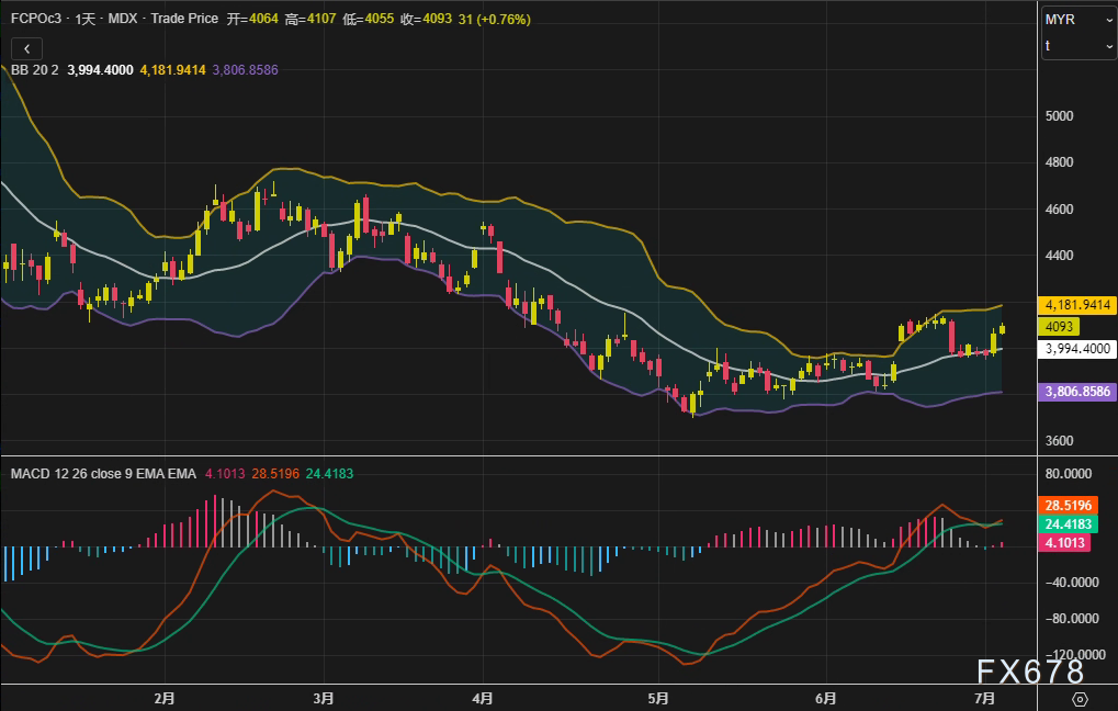 汇通财经APP讯——周四(7月3日),马来西亚衍生品交易所(BMD)棕榈油主力合约FCPOc3延续反弹,9月合约收报4093林吉特/吨,日内上涨31林吉特(0.76%),连续第二日收高。技术指标显示,布林通道中轨位于3994林吉特,MACD柱状线收窄至4.1,短期动能有所修复。市场呈现多空拉锯格局:大连商品交易所豆油(DBYcv1)和棕榈油(DCPcv1)分别上涨0.15%和1.22%,为马盘提供支撑;而芝加哥期货交易所(CBOT)豆油(BOcv1)微跌0.05%,叠加国际原油价格回落,抑制了棕榈油上行空间。