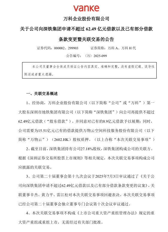 2025年以来,万科分别于2月11日、2月22日、4月30日、5月15日、6月7日发布公告,深铁集团分别向万科提供28亿元、42亿元、33亿元、15.52亿元、30亿元的借款。若加上此次62.49亿元借款后,万科公开披露的向深铁集团申请的借款总额约211.01亿元。