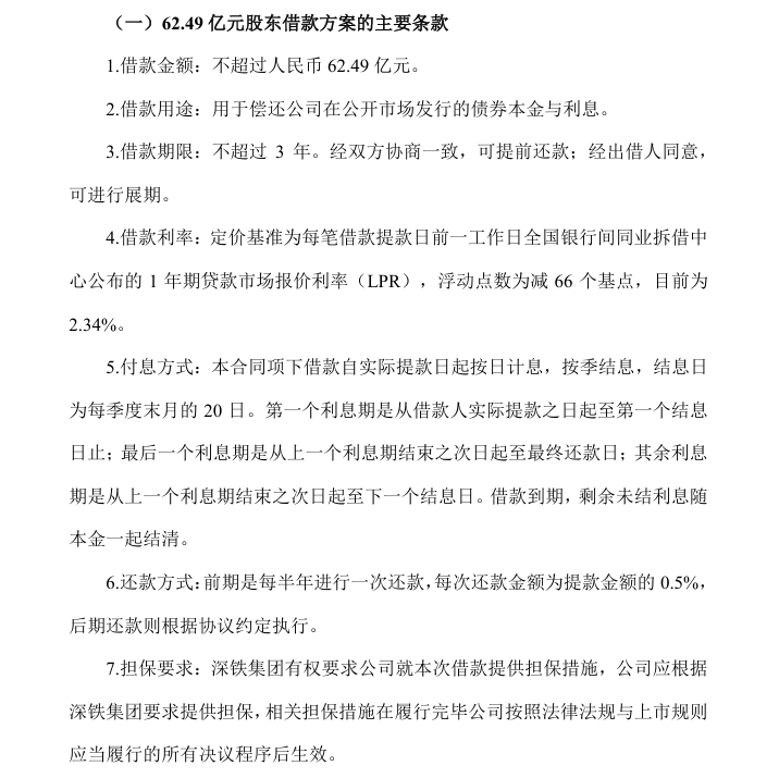 公告显示,此次不超过62.49亿元的借款,借款期限不超3年,经双方协商一致可提前还款;经出借人同意,可进行展期。此次借款定价基准为每笔借款提款日前一工作日全国银行间同业拆借中心公布的1年期贷款市场报价利率(LPR),浮动点数为减66个基点,目前为2.34%。