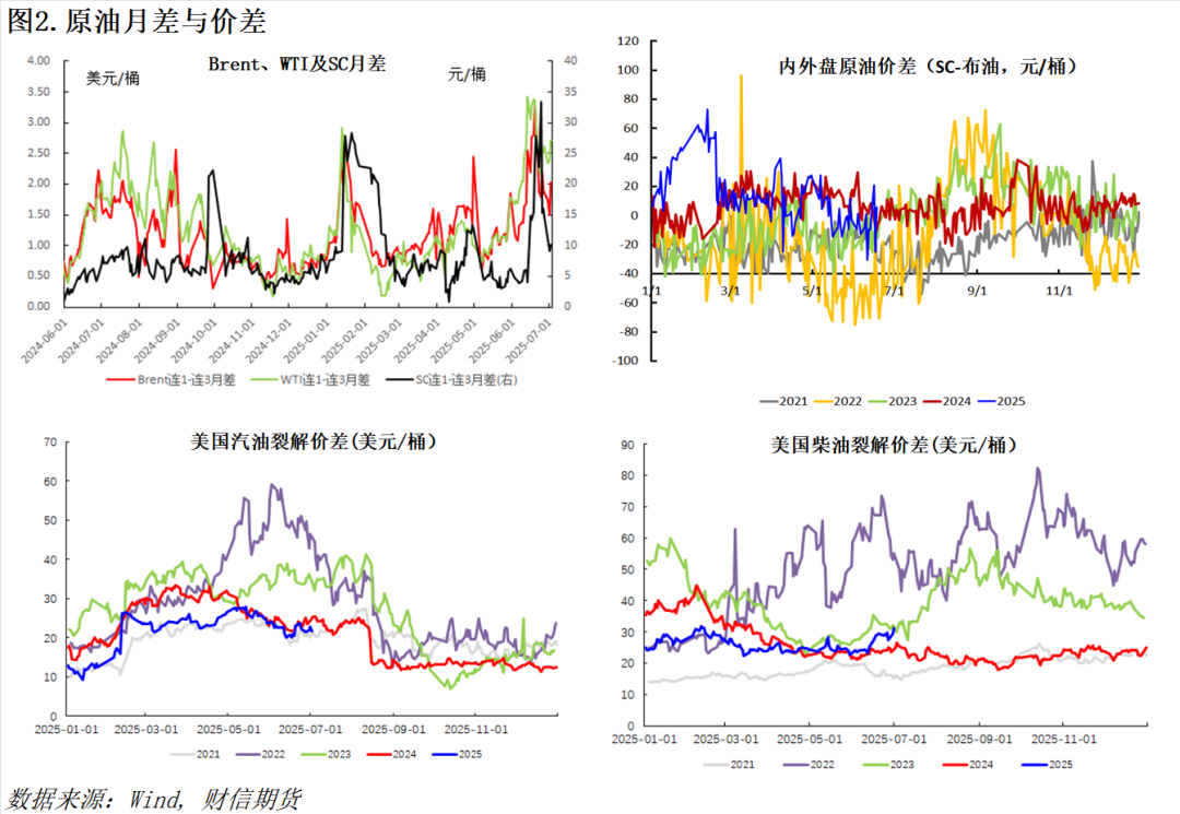 内外盘价差:上半年INE原油较布伦特原油溢价先缩后扩,前期主因人民币升值以及OPEC+增产带来内外价差走弱,6月伊以冲突爆发,国内原油进口担忧使得内外价差再度走扩。
