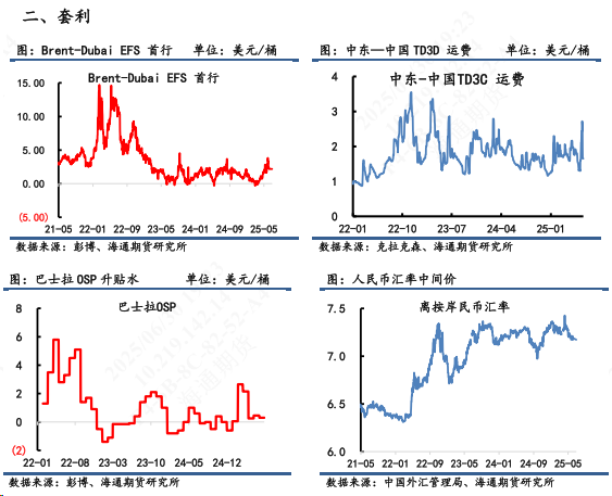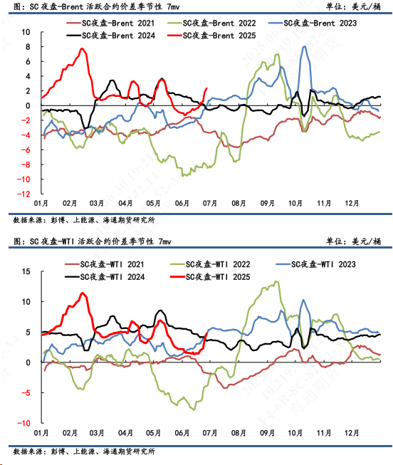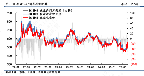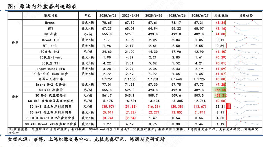 2)套利:①估值:6月27日凌晨2:30,Brent 2508盘面价为67.73美元/桶,SC 2509盘面价为489.8元/桶,测算SC 2509盘面理论价为503.5元/桶,当天盘面估值偏离程度-2.71%。从7天移动平均估值值中,以【-5%,0】为正常区间来看,目前仍处于合理估值范围内。由于6月13日之后地缘爆发升级造成的估值大幅脱离程度已然有所修正。②利润:测算SC2509盘面到岸利润-13.67元/桶,折合-1.91美元/桶。③价差:SC2509-Brent2508盘面差为0.56美元/桶,理论差2.46美元/桶,盘面价差低于理论价差。(注:本周Brent首行为2508;SC首行为2508;其中M代表时下6月)