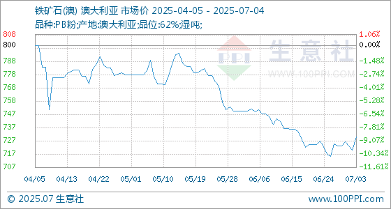 7月4日生意社铁矿石(澳)基准价为730.67元/吨
