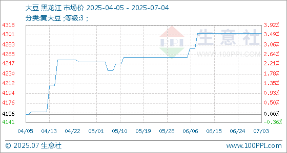 7月4日,生意社大豆基准价为4304.00元/吨,与本月初持平。