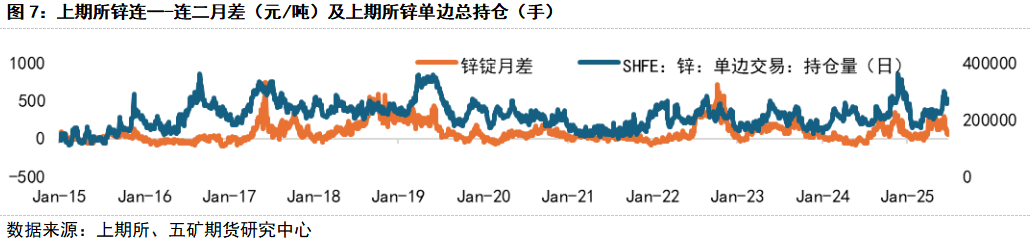 从矿冶利润分配看,锌精矿 TC 在低位横移后拐头向上,矿山利润由高位滞涨转为下跌,冶炼利润则出现上行。此外,前一轮做多资金或月差资金离场,往往伴随持仓下行,月差也逐步由强转弱,可作为参考指标。
