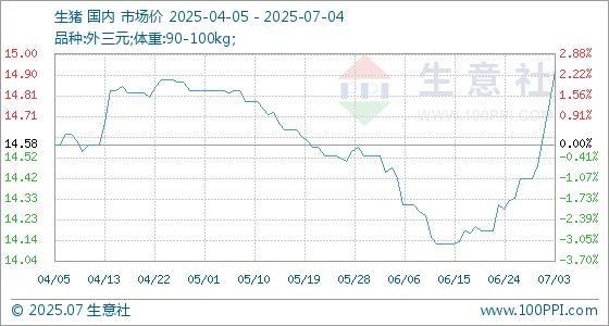 7月4日,生意社生猪基准价为14.92元/公斤,与本月初(14.48元/公斤)相比,上涨了3.04%。