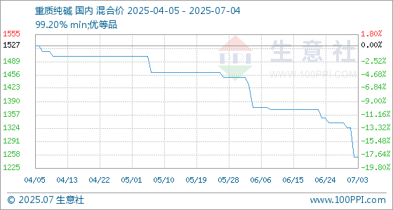 7月4日生意社重质纯碱基准价为1252.50元/吨