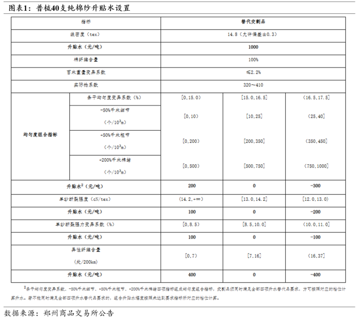 修改后,可交割品范围将从原有的机织C32S扩大为机织和针织的C32S和C40S。从交易所的仓单日报中可以看到,棉纱仓单的编码从原来的Q2B2Y1(分别代表单纱断裂强度、单纱断裂强度变异系数(%)和异性纤维含量(处/200km) 三个指标)变成了32J1Q1B1Y1,增加了32的支数指标。叠加各项指标从原先的大于/小于某个数值转化为各个指标范围,不同范围设置不同升贴水的方式,可交割品范围显著扩大。仓单的有效期则从原先的2个月提升到了4个月,给予了企业卖方更宽裕的时间进行仓单的注册和买卖销售。入库棉纱的生产日期从不可超过180天转为不可超过120天,缩短了2个月,限制了将棉纱不断向后移仓的可能。此外,一张棉纱仓单的量从以前的20吨提升至30吨。