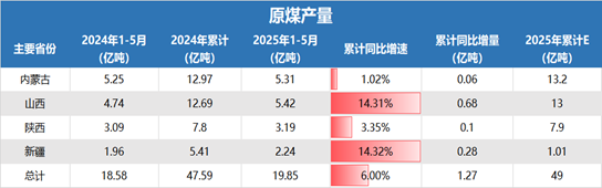 国家发改委强调持续增强煤炭生产供应能力,强化煤炭兜底保障作用,煤炭供应总体稳增。1—5月份,全国规上工业企业原煤总产量累计为19.9亿吨,同比增长6.0%。1-4月炼焦煤产量同比增加8.51%,焦炭产量同比增加3.20%。《能源法》要求建设山西、蒙西、蒙东、陕北、新疆五大煤炭供应保障基地,未来工作重点将优化供需结构,促进煤炭清洁高效利用。