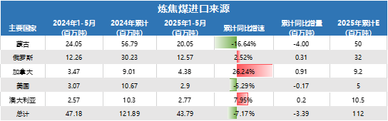 能源局提出增强海外资源供应保障能力,巩固拓展与煤炭资源大国合作。价格下行影响,1-5月我国进口炼焦煤同比下降7.17%,炼焦煤进口量4月、5月环比减量,减量主要来自俄罗斯、美国。俄罗斯方面,受国内市场持续下滑影响,部分矿山财务压力增加,矿山转售其他国家渠道,主流主焦、肥煤进口量缩水,4月份进口量环比下滑9.3,5月份环比下滑25.2%。美国方面,关税影响,进口受限,4-5月到港量仅1船。澳大利亚方面,国内部分企业2025年签订澳洲矿山长协,3-4月开启常规月度到港到量,后续澳大利亚煤炭进口将呈现增涨。蒙古国方面,2025年整年计划对华出口炼焦煤增长至6000-6500万吨水平,受国内煤炭价格持续下行影响,实际累计发运量低于同期16.64%。