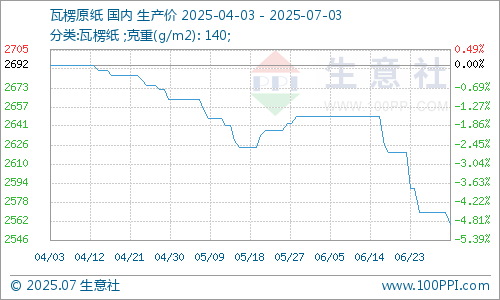 据生意社商品行情分析系统:本周瓦楞纸价格仍有小幅下调。截止2025年7月3日瓦楞原纸140g出厂均价为2560元/吨,与6月29日均价相比下降了0.39%。