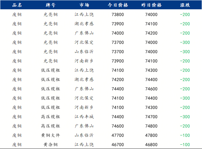 上游持货商整体库存偏低,影响不大,或逢低补库,或空仓等待实际,贸易商快进快出,对后市看跌的态度较强;下游铜厂成品订单销量减少,采购需求减弱,仅有少量需要补足前期订单的需求。