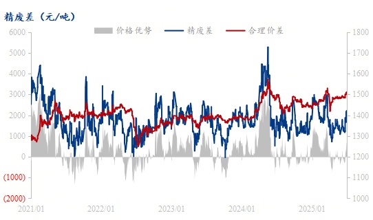 分析:今日精废差为1852元/吨,收窄354元/吨,目前精废差在合理价差1506元/吨之上。
