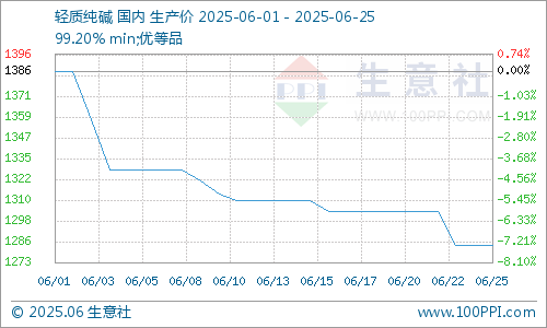 据生意社商品分析系统显示,6月25日轻质纯碱价格暂稳,市场均价在1284元/吨,与上一交易日价格1284元/吨相比持平,较月初跌幅7.36%。
