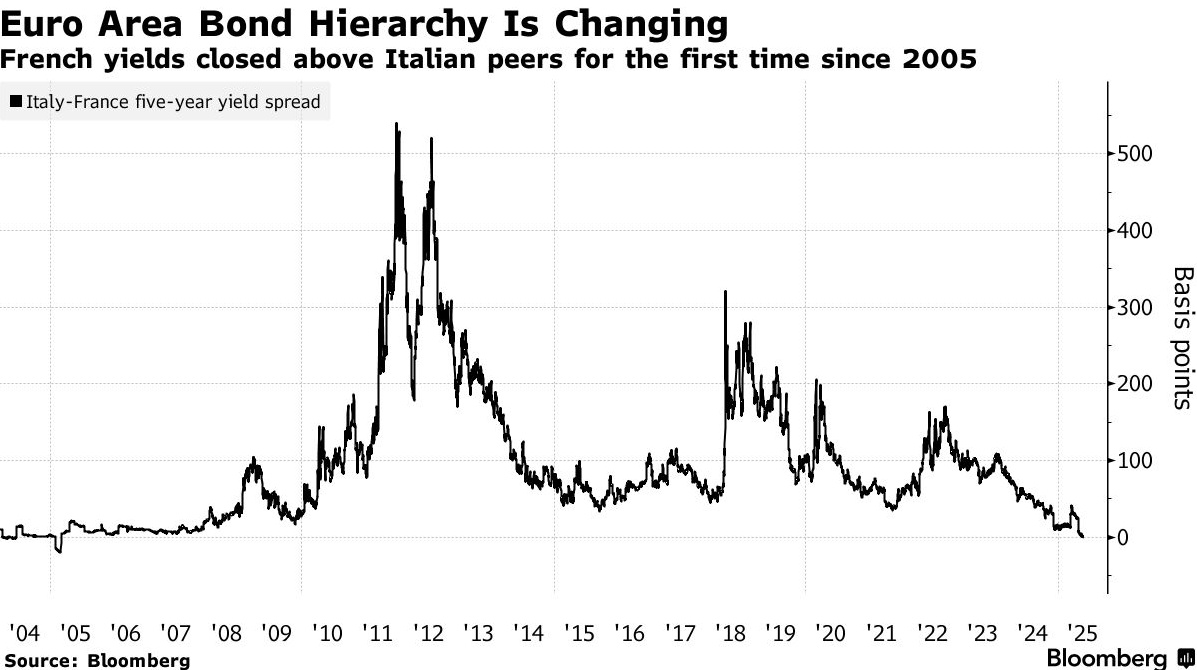 德国商业银行利率与信贷研究主管克里斯托夫.里格尔指出,巴黎当前的政治僵局与财政改革受阻,已对法国债务吸引力构成实质性冲击。作为欧元区传统"安全资产"代表,法国债券竟与素以财政宽松著称的意大利站在同一风险定价水平——意大利10年期国债相对于法国的收益率溢价已收窄至17个基点,创2007年以来最低纪录,较三年前近200个基点的差距大幅缩水。