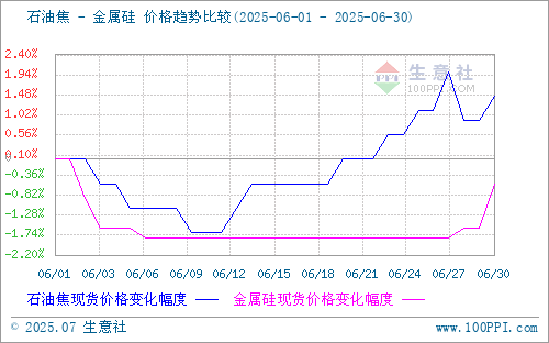 需求端:6月国内金属硅#441现货市场整体呈现出了先跌后稳的运行态势。6月上旬,端午节后归来,金属硅#441现货市场整体呈弱势走跌运行,下游需求提振缓慢,市场商谈重心向下调整。6月中下旬,金属硅#441现货市场整体持稳整理运行为主,现货市场行情波动不大,供需表现稍显僵持。硅行业对石油焦市场需求仍存。