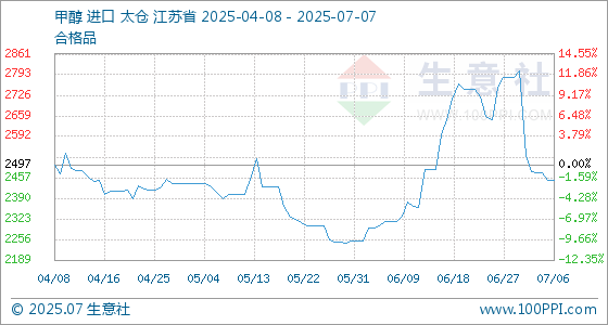 7月7日,生意社甲醇基准价为2447.50元/吨,与本月初(2805.00元/吨)相比,下降了12.75%。