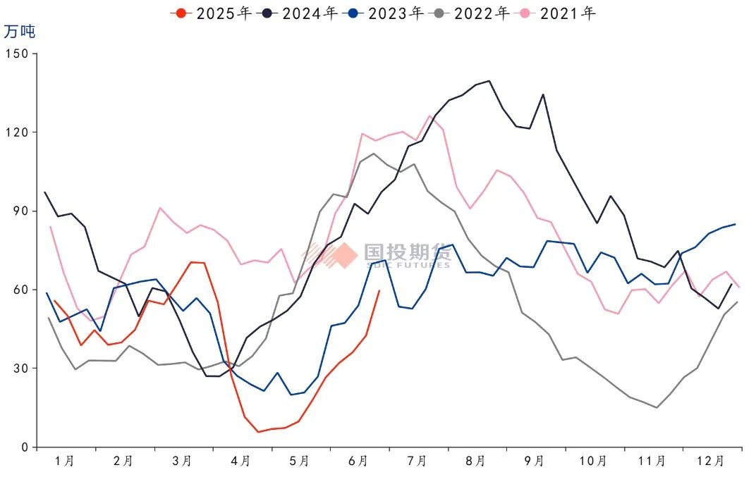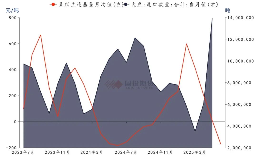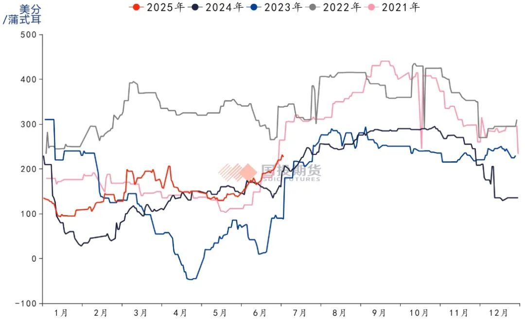 关税问题是上半年农产品板块关注的焦点问题,但关税问题暂时并没有对供应端产生太多冲击,影响更多的还是节奏问题。比如,由于巴西收割进度和物流瓶颈,以及关税由激化到缓和,上半年我国大豆到港量出现“前低后高”的情况,前5个月大豆进口总量与去年同期基本持平,豆粕基差跟随大豆到港量反向波动(图10)。国内豆粕库存仍呈现一定季节性,区域间存在“南紧北松”的格局,这表明即便近期到港量在提升,但库存并没有太大压力(图11),下游仍有一定的承接能力。以往下半年中国采购大豆将由南美转向北美,但由于中美关税等问题仍存在很大不确定性,预计国内油厂更多采取随用随采的方式,这将有利于调节国内豆粕的库存水平。此外,如果关税或北美天气出现异常,那么这部分缺口将继续由南美弥补,只是南美大豆的升贴水可能会继续抬升(图12),从而可能会压缩油厂的利润。所以下半年关税和天气因素是大豆市场关注的两个焦点,且都存在很大的不确定性,这种不确定性可能会加大市场波动,若关税和天气都朝着不利的方向发展,那么豆粕重心有望继续抬升,“多农空工”的机会仍然存在。