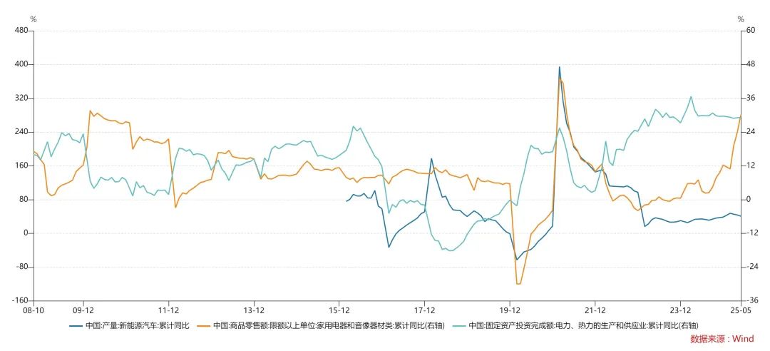 多数情况下,房屋销售会带来一波家装需求,数据层面体现为,我国商品房销售数据与我国家电销售数据整体呈现正相关的关系(图2),且商品房销售数据有时领先家电销售数据1-3个月。预计此轮房地产销售数据的边际改善有利于家电产销数据整体维持稳定向上,叠加去年以来全国各地推出家电“以旧换新”的政策。数据显示,在商品零售额中家用电器和音像器材类累计同比,去年下半年以来持续回升,截至今年5月该数值高达30.2%。从而抵消家电出口增速的下滑,家电产销下半年有望维持向好。在大宗商品板块中,家电对有色金属需求提振最为显著,其中家电用铜量占铜总消费大概15%左右。此外,无论是新能汽车产销量还是电力固定资产完成额,这类数据都对铜需求有支撑(图3)。