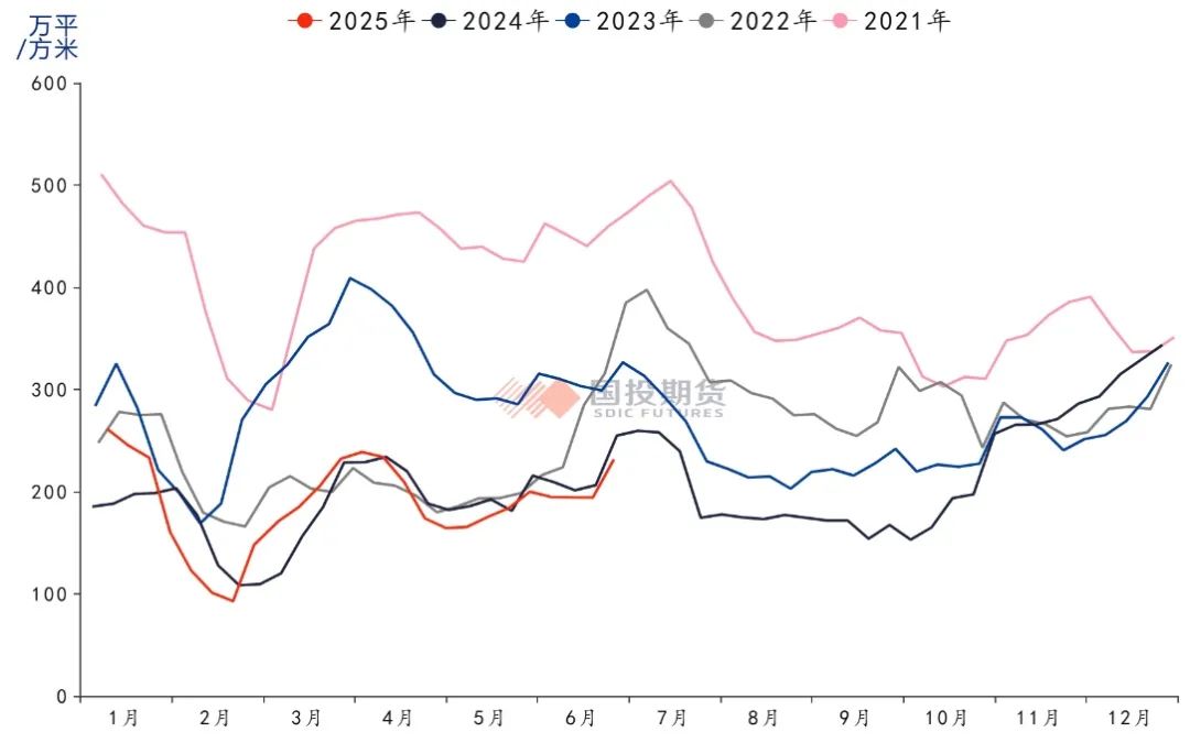 房地产销售数据边际改善提振了部分有色金属的需求,与此相反,房地产开工和施工持续偏弱的数据对黑色和建材板块的拖累也是显而易见的。在大宗商品中,房屋从新开工到竣工阶段主要影响的是钢材类,PVC和玻璃这些建材类需求。以数据为证,我国新屋开工率与粗钢产量累计同比具有高度趋同性(图4),而竣工面积累计同比与浮法玻璃产量累计同比同样具有高度趋同性(图5)。由于粗钢和浮法玻璃进口量和出口量相比产量都较小,因此可以简单地将产量等同于表观消费量。从这个角度,未来房地产新屋开工和施工的走向,对煤焦钢矿和建材板块可能仍是主导因素。通常需要房地产销售数据持续好转,才能逐渐提振房企拿地的积极性,带领新屋开工等数据逐渐回升。只是,当前房地产销售数据边际改善更多还是得益于短期刺激政策集中释放,后期能否维持这种逐渐改善、重回正增长水平还有待进一步观察。从高频数据来看,当前房屋销售数据仍处于偏低水平。取我国十大城市商品房周度销售面积的4周移动平均值(图6),并进行季节性分析可见,当前该数值仍低于往年同期水平,且除3月份之外,多数时间都是这种格局。同样,三十大城市的商品房销售数据亦是如此(图7)。这意味着,去年下半年密集型释放刺激政策对地产销售的确带来很大提振,但在刚需释放之后,销售端又略显疲态,后期销售数据可能会回到低位,并持续一段较长的时间,恐怕难以对新屋开工和施工数据带去向上的驱动。