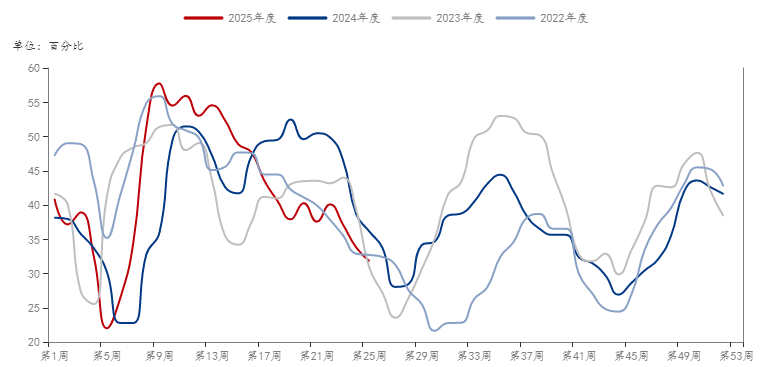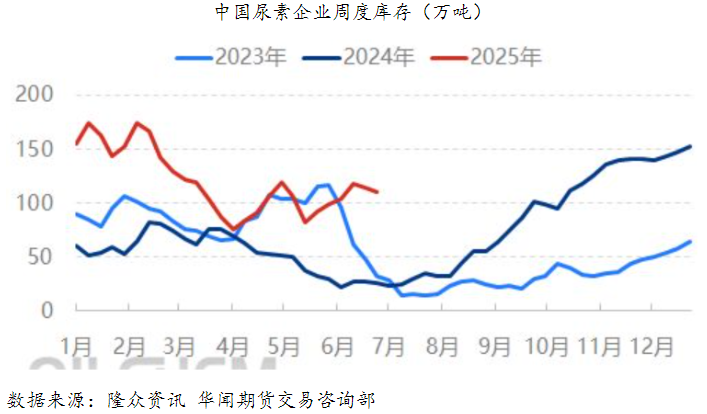 截止2025年6月25日,中国尿素企业总库存量109.59万吨,较上周减少4.01万吨,环比减少3.53%。本周期国内尿素企业库存延续下降,近期尿素继续集港,一定程度加速部分尿素企业出货。但国内市场行情受情绪引导,偏弱震荡,部分时间尿素企业国内出货并不顺畅,企业库存整体去库有限。