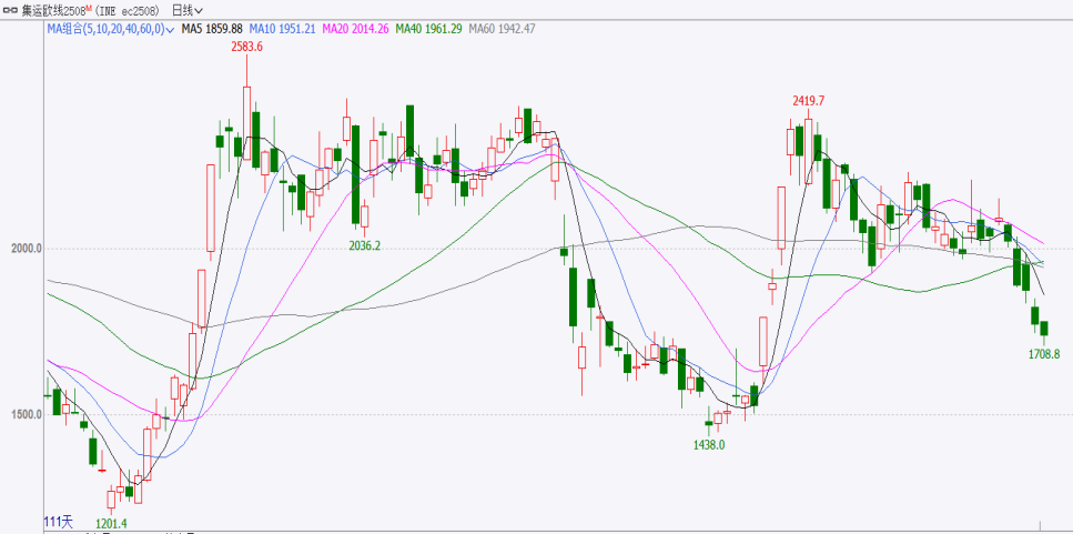 集运市场目前利空因素较多,投资者心态相对偏弱,今日期价维持承压回落走势,主力EC2508合约收于1740.2点,环比下跌3.07%。
