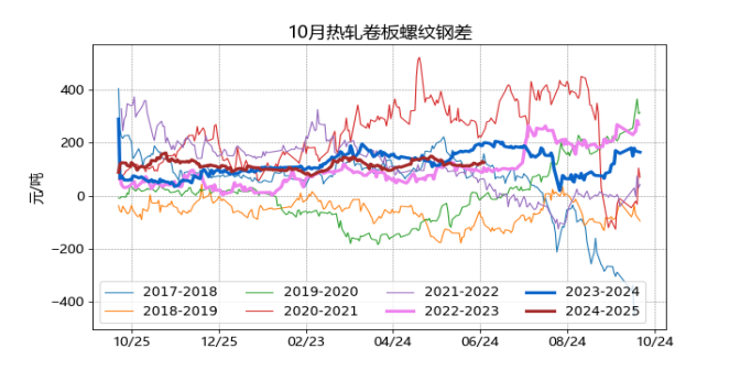 预计10月热轧卷板与螺纹钢价差走缩,建议入场点位140-170,止损点位185-200,止盈点位90-100。
