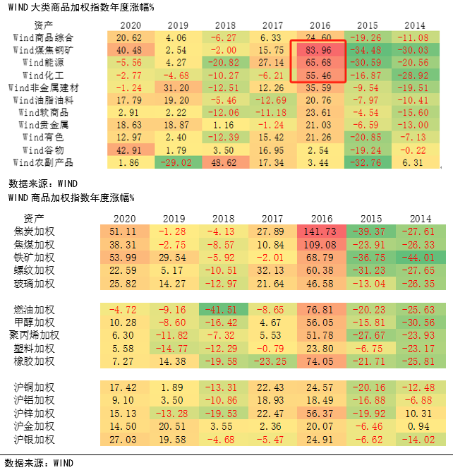 煤焦钢矿涨幅83.96%;能源涨幅65.68%;化工涨幅55.46%;贵金属涨幅21.03%;有色涨幅21.26%;油脂油料涨幅20.76%。