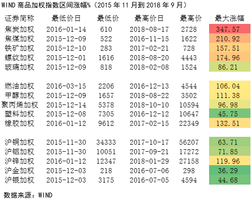 金属涨幅相对偏小。沪铜加权最大涨幅63.71%;沪铝加权最大涨幅71.85%;沪锌加权最大涨幅119.96%。