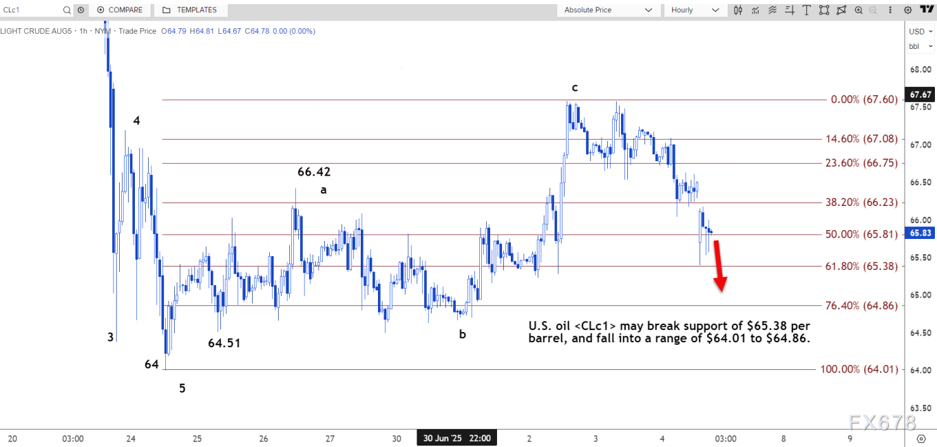 路透技术分析师指出,美国原油可能跌破每桶 65.38 美元的支撑位,跌至 64.01 美元至 64.86 美元的区间。