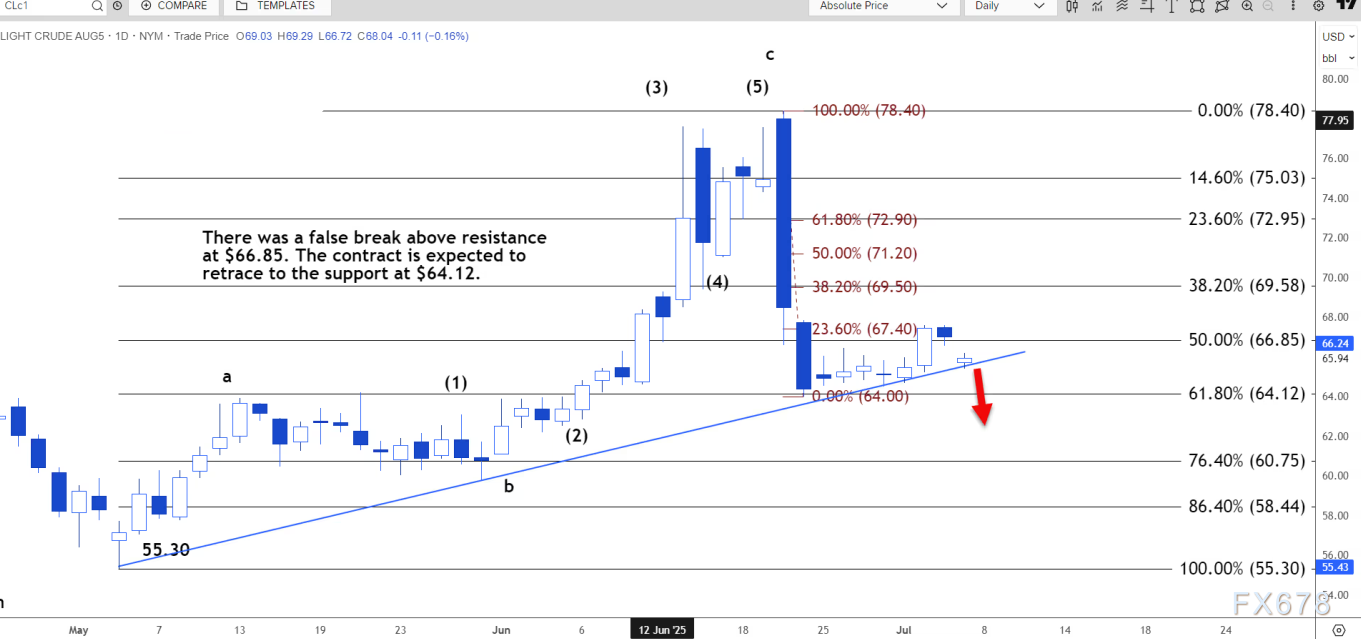 该支撑位被确定为64.01美元至67.60美元上涨趋势线的61.8%回撤位。一旦突破该阻力位,市场很可能重新回到6月24日的低点64美元。