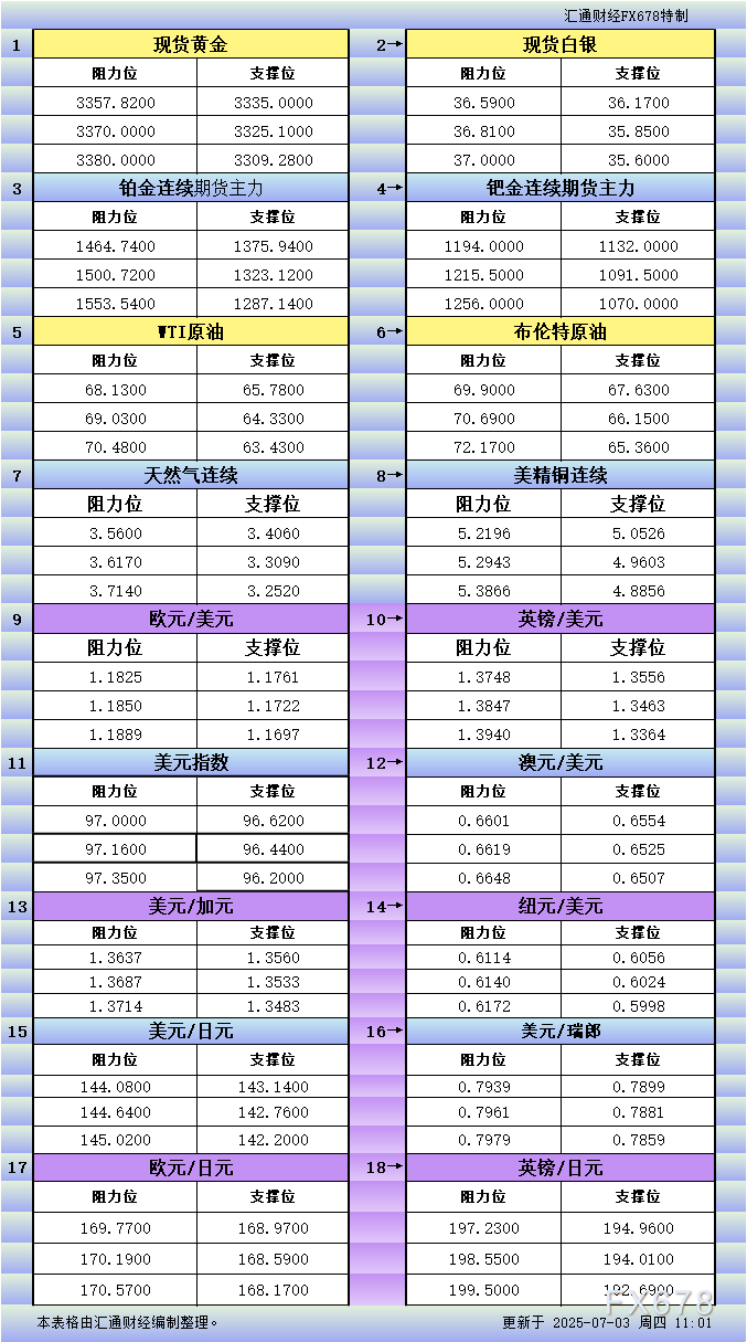 汇通财经APP讯——7月3日亚市更新的黄金、白银、铂金、钯金、原油、天然气、铜(商品)以及:美元指数、欧元、英镑、日元、瑞郎、澳元、加元、纽元(热门货币对)的支撑阻力位一览。