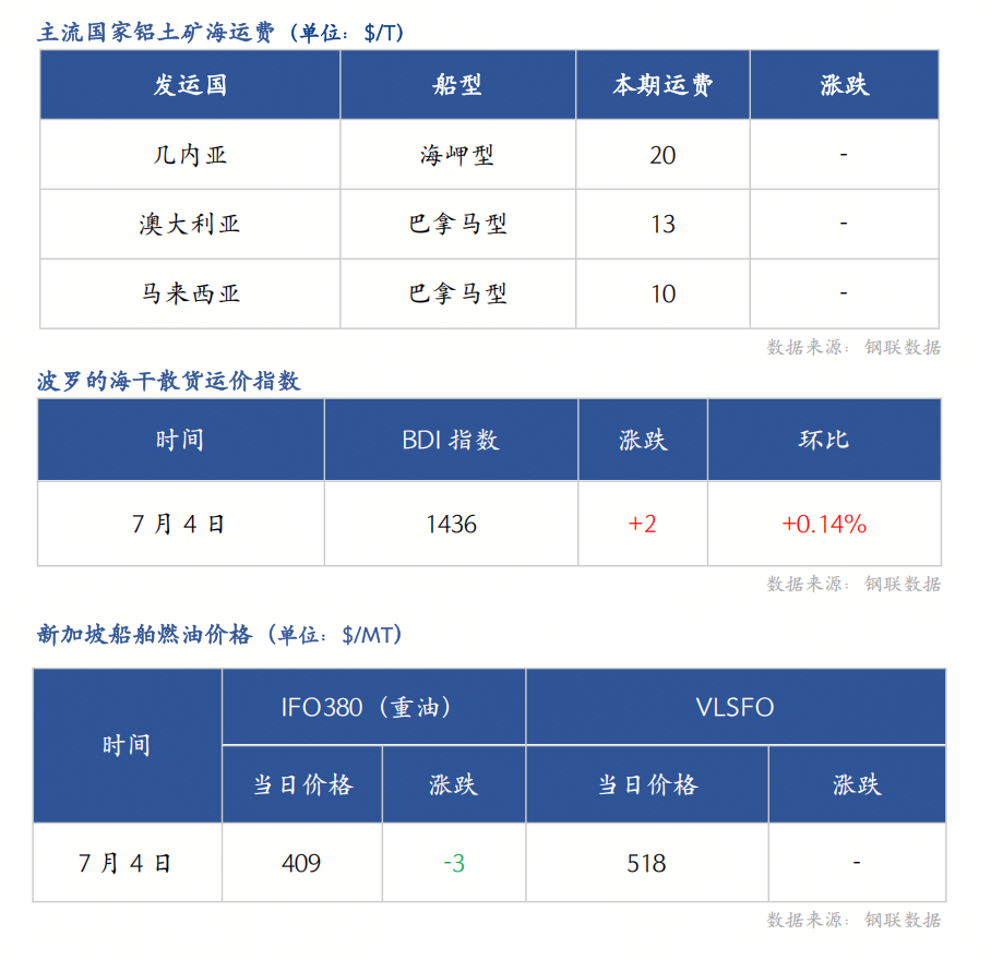 7月7日国外主流矿价总体持稳,国内山西AL:58%,A/S:5规格的一水硬铝土矿价格有所上涨,市场上有新的成交。几内亚海运费继续持稳,波罗的海干散货运价指数在连续几日下降后出现回升,但提振不大;新加坡船舶燃油价格继续呈下降态势。