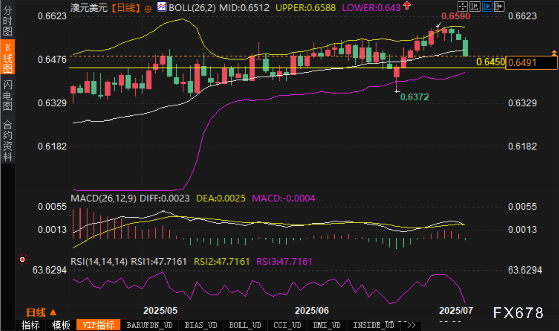 当前市场推测,美国将对部分贸易伙伴施加新的进口关税,尽管财长Bessent提及“可能延至8月1日”的宽限期,但在缺乏关键数据与政策明晰前,市场情绪趋于谨慎。与此同时,澳大利亚经济对全球贸易高度依赖,全球贸易链紧张直接冲击澳元基本面,RBA(澳洲联储)也预期将在本周二下调官方现金利率25个基点,并伴随鸽派措辞。