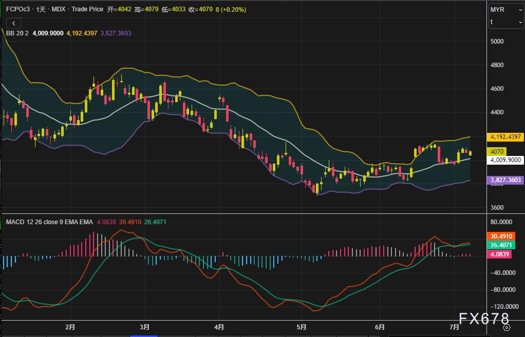 汇通财经APP讯——马来西亚棕榈油期货周一(7月7日)逆势收涨,尽管亚洲交易时段早盘受豆油拖累一度承压,但原油价格反弹最终带动市场情绪回暖。截至收盘,Bursa Malaysia交易所主力9月合约FCPOc3报4070林吉特/吨,微涨8林吉特(0.2%)。日线图上,布林通道中轨位于4009林吉特,MACD柱状线收窄至4.08,显示短期动能虽有减弱,但价格仍站稳关键支撑上方。