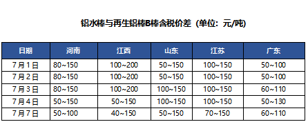 【我的钢铁】7月7日A00铝锭现货价华东20640,跌140;华南20600,跌80;中原20500,跌130(单位:元/吨) 。铝价回落,市场需求支撑有限,再生铝棒企业跟盘下调价格出货,今日再生铝棒价格下跌50-100元/吨。