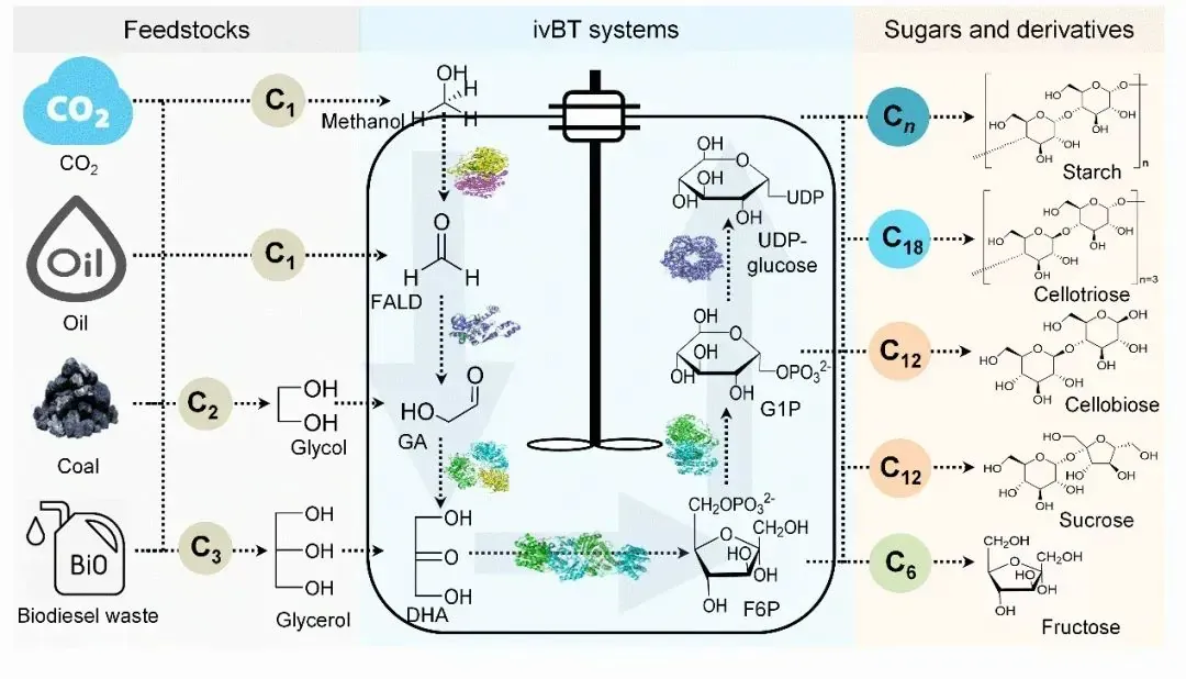科研人员开发的体外生物合成系统可以耦合电催化 / 热催化还原二氧化碳过程,真正实现二氧化碳从头转化合成蔗糖。