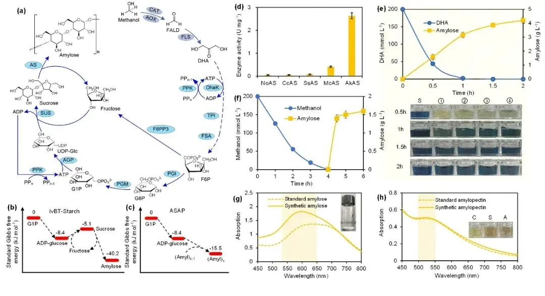 与天然合成途径相比,这条生产线的反应步骤和能量消耗具有显著优势。科研人员进一步构建了人工生物转化系统,突破关键酶限速瓶颈,实现甲醇等非粮低碳分子合成蔗糖,产物浓度达到 14g / L。