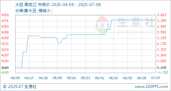 7月8日,生意社大豆基准价为4304.00元/吨,与本月初持平。