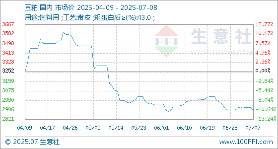 7月8日,生意社豆粕基准价为2898.00元/吨,与本月初(2906.00元/吨)相比,下降了0.28%。