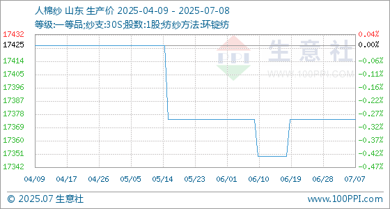 7月8日,生意社人棉纱基准价为17375.00元/吨,与本月初持平。