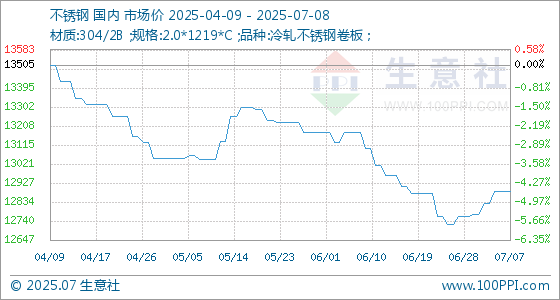 7月8日生意社不锈钢基准价为12887.50元/吨